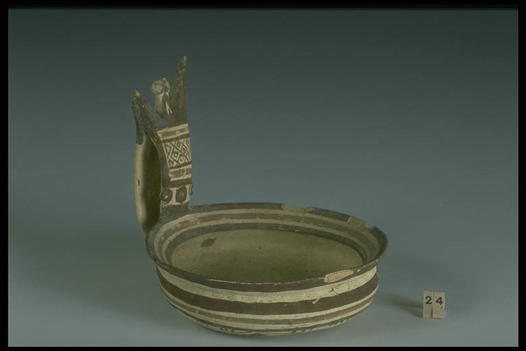 Labbro obliquo, vasca bassa a profilo convesso, alta ansa a nastro terminante con due corni tra i quali una protuberanza plastica con elemento trapezoidale e due globi oculari. Decorazione bicroma con motivi a fasce, trapezi, losanghe e doppie protomi d'uccello.