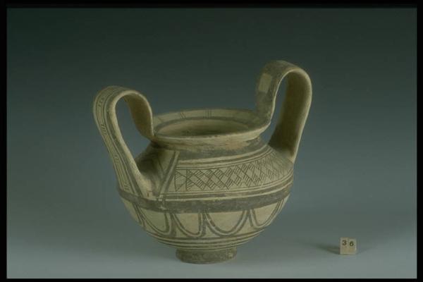 Breve labbro svasato, corpo biconico, piede troncoconico, anse a nastro verticali. Decorazione monocroma con motivi a linee, fascia campita a losanghe, semicerchi.