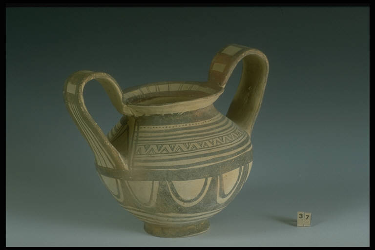 Breve labbro svasato, corpo biconico, piede troncoconico, anse a nastro verticali. Decorazione monocroma con motivi a linee, puntini, semicerchi e fascia campita a triangoli.