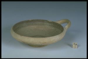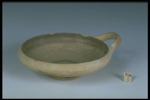Orlo introflesso, vasca a profilo convesso, piede troncoconico, ansa a nastro impostata obliquamente. Decorazione monocroma con fascia all'esterno e cerchi concentrici all'interno della vasca.
