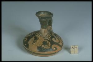Testa femminile di profilo. Decorazione accessoria: sul collo baccellature, sotto l'ansa palmetta tra volute.,