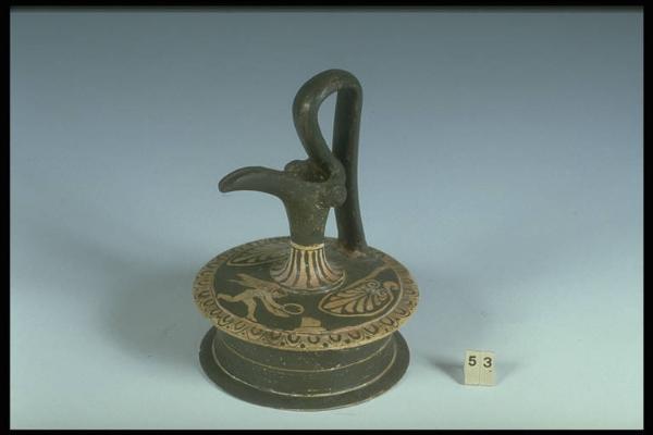 Sulla spalla Eros sacrifica una corona ed una patera dinanzi adun'ara. Decorazione accessoria: baccellature sul collo, sul bordo della spalla kyma e punti, ai lati dell'ansa palmette tra volute.,