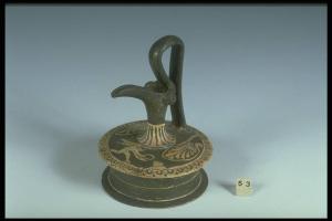 Labbro a becco obliquo con protuberanze plastiche laterali, collo cilindrico, spalla a profilo arrotondato, corpo a rocchetto, ansa verticale a nastro.