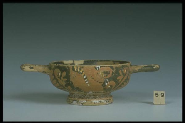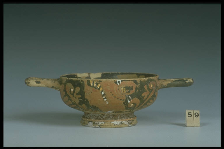 A e B: testa femminile di profilo. Decorazione accessoria: sotto le anse palmette tra volute.,