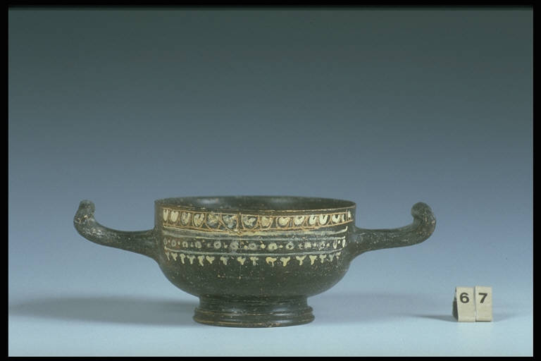 Orlo arrotondato verticale, vasca cilindroide, piede cilindrico sagomato, anse a bastoncello con bordi rilevati. Decorazione: in A, dall'alto, kyma, linee, punti e foglie d'edera; in B, linea spezzata con foglie d'edera.