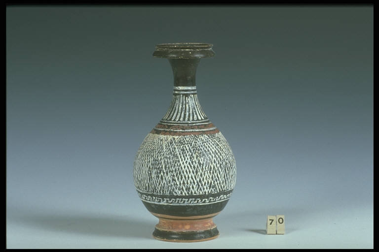 Labbro a disco sagomato, corpo ovoidale, piede troncoconico. Decorazione: sul collo linee e baccellature, sul corpo zona a reticolato e fascia a meandro.
