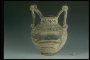 Orlo arrotondato estroflesso, collo cilindrico, corpo globulare, piede troncoconico, anse a triplo bastoncello. Decorazione monocroma a linee, fasce, svastiche , rosette, triangoli campiti a puntini, sul collo elementi floreali stilizzati, raggera sulle rotelle.