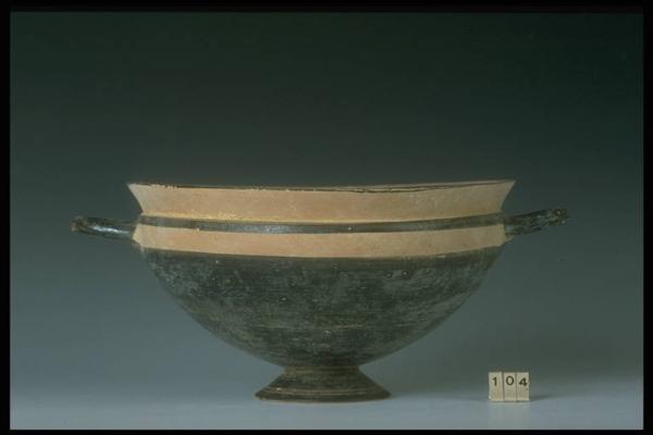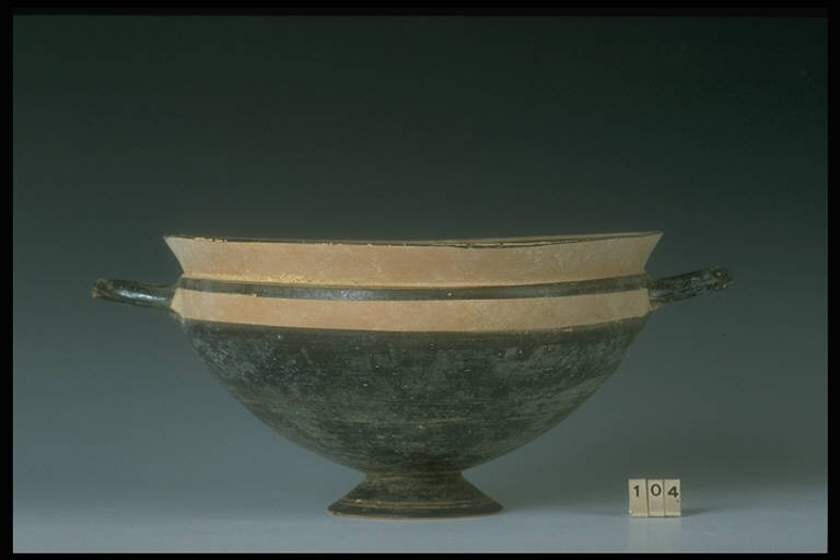 Labbro ad imbuto, vasca emisferica, piede troncoconico, anse a bastoncello.