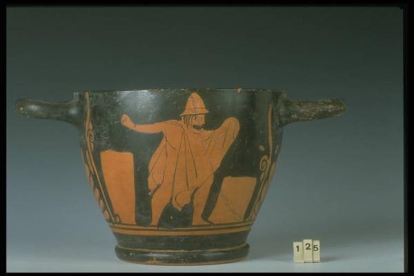 Lato A: figura maschile panneggiata, ara rettangolare nel campo. Lato B: figura maschile barbata, panneggiata e con elmo a pileo, tra due are. Decorazione accessoria: palmetta tra girali sotto le anse, due linee risparmiate sotto le scene figurate.,