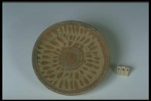 Orlo arrotondato, vasca a tesa orizzontale, piede cilindrico; due fori di sospensione. Vasca decorata all'interno da tre file di gocce concentriche.