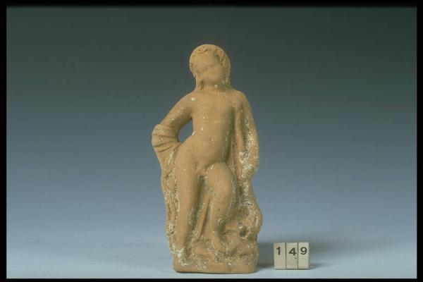 Erote aptero appoggiato ad una roccia, reca un mantello e forse un arco sulla spalla sinistra, ed una corona sul capo