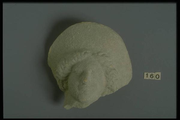 Testina femminile con polos e capelli divisi in due bande; orecchini a bottone.