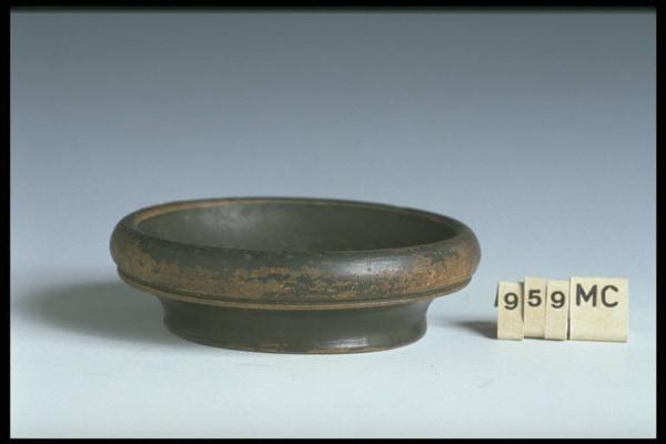 Labbro rientrante ed arrotondato; vasca a pareti convesse, legg. più bassa del piede da cui è separata mediante un collarino a cercine; piede largo, a pareti concave, faccia interna verniciata