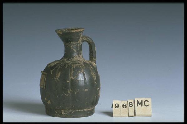 Sul bocchello: liletti incici orizzontali, paralleli; sulla spalla: fascia di palmette impresse; sul ventre: serie di solchi incisi verticali e paralleli, interrotta ai lati dell'innesto inferiore dell'ansa; sotto l'ansa: croce di S. Andrea incisa;,