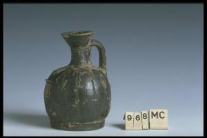 Bocchello a tromba; collo corto, distinto dalla spalla mediante un filetto inciso, con risega all'attacco del bocchello; ansa verticale, a bastoncello, innestata al collo ed al ventre; ventre lenticolare, rigonfio in alto; piede largo, ad anello, con scanalatura all'attacco del ventre
