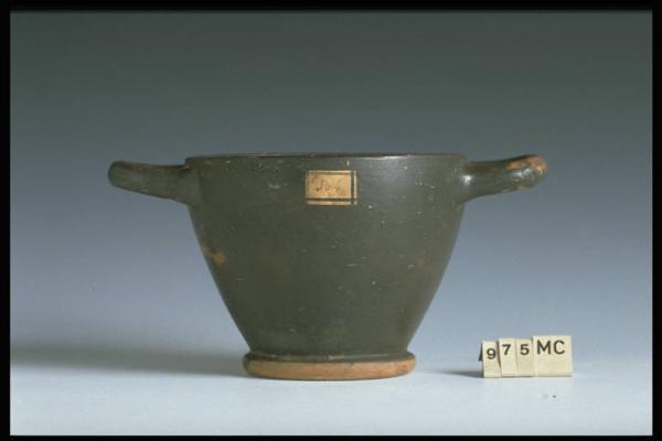 Imboccatura dall'orlo legg. rientrante; anse orizzontali, spesse, a bastoncello, innestate appena sotto l'imboccatura, legg. rivolte in alto; vasca ovoidale, con pareti spesse dal profilo convesso, rastremate in basso e rientranti in alto; piede a echino capovolto, ben sporgente, largo, metà faccia interna verniciata, fondo esterno con cerchio e punto centrale in vernice