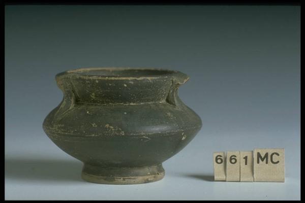 Orlo arrotondato, collo svasato, corpo biconico, piede ad anello lievemente ingrossato; anse non funzionali attaccate al collo.