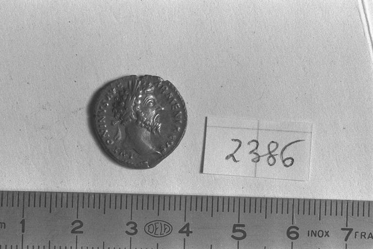 Recto: Testa laureata di M. Aurelio, a destra . Contorno di perline.\nVerso: Marte, con elmo e vesti militari, stante, a destra , impugna la lancia verticale puntata a terra con la destra e appoggia la sinistra sullo scudo rotondo posato a terra. Contorno di perline.