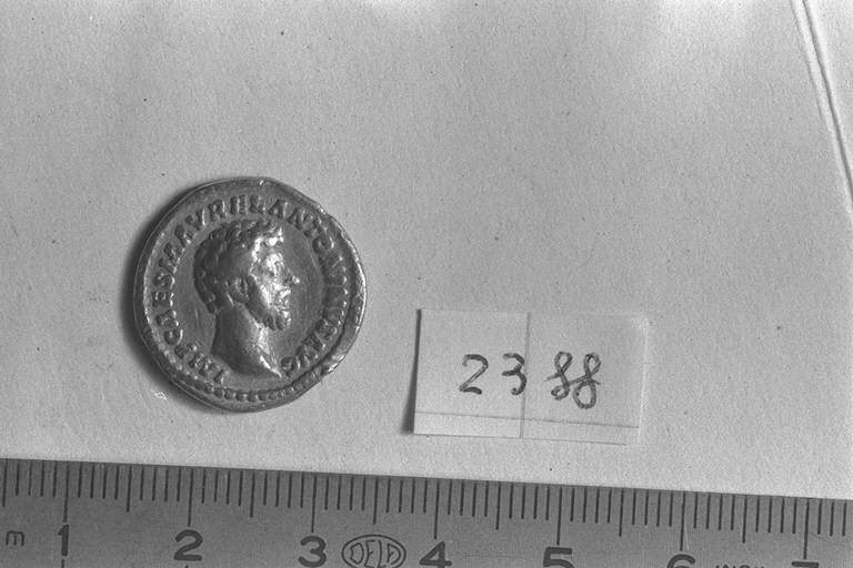 Recto: Testa nuda di M. Aurelio, a destra . Contorno di perline.\nVerso: M. Aurelio, laureato, togato, a destra , e L. Vero, a testa nuda, togato, a sinistra, stanti, a sinistra e a destra , si stringono la mano. Contorno di perline.
