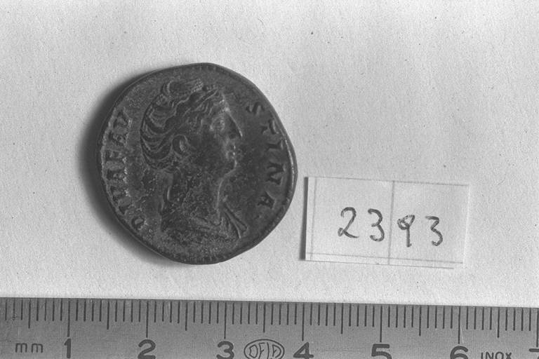 Recto: Busto drappeggiato di Faustina I, a destra , con diadema di perle sulla fronte. Contorno di perline.\nVerso: Vesta, velata, drappeggiata, stante, a sinistra, sacrifica davanti all'altare, ornato con ghirlanda, con patera nella destra e lunga torcia accesa nella sinistra. Contorno di perline.