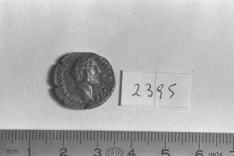 Recto: Testa nuda di Antonino Pio, a destra . Contorno di perline.\nVerso: Concordia, drappeggiata, stante, a sinistra, con patera nella destra protesa e doppia cornucopia nella sinistra, appoggia il gomito sinistro alla colonna. Contorno di perline.