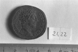 Recto: Testa laureata di M.Aurelio, a destra . Contorno di perline.\nVerso: Marte, con elmo e vesti militari, in corsa, a sinistra, con Victoria nella destra protesa e trofeo nella sinistra appoggiato alla spalla. Contorno di perline.