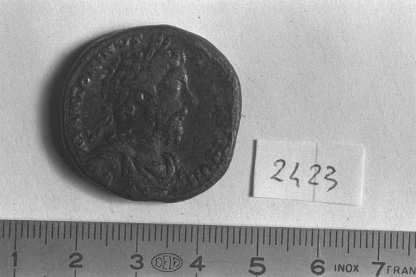 Recto: Busto laureato, drappeggiato e corazzato di M.Aurelio, a destra . Contorno di perline.\nVerso: Veduta frontale di tempio tetrastilo su podio di quattro gradini. Al centro statua di Mercurio con petaso e corta veste, stante, di fronte, su base, con borsa nella destra e caduceo nella sinistra. Colonne con teste come capitelli; sul frontone circolare, da sinistra a destra ,una borsa, un gallo a sinistra, un ariete a sinistra retrospiciente, un petaso, un caduceo alato e una tortora. Contorno di perline.