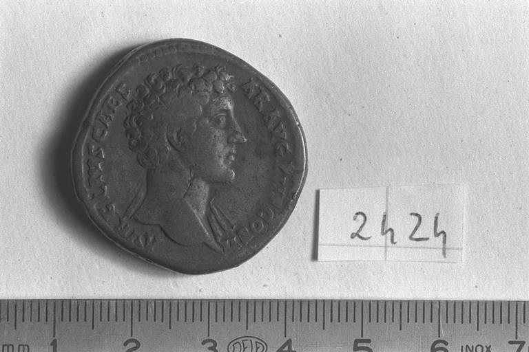 Recto: Testa nuda di M.Aurelio, a destra , con lembo di drappeggio sulla spalla sinistra. Contorno di perline.\nVerso: Hilaritas, drappeggiata, stante a sinistra, con lungo ramo di palma nella destra e cornucopia nella sinistra. Contorno di perline.