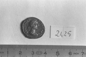 Recto: Busto drappeggiato di Faustina II, a destra , con filo di perle nei capelli, raccolti a chignon. Contorno di perline.\nVerso: Giunone velata, drappeggiata, stante, a sinistra, con patera nella destra protesa e lungo scettro nella sinistra; ai suoi piedi, a sinistra, pavone stante, a sinistra, retrospiciente. Contorno di perline.