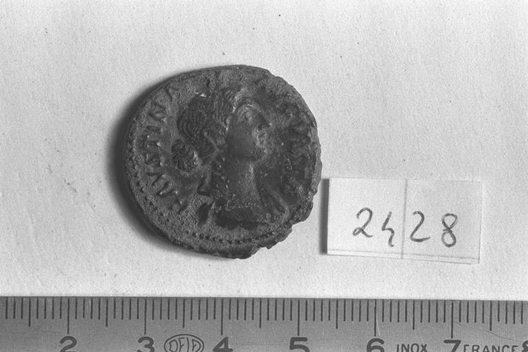 Recto: Busto drappeggiato di Faustina II, a destra , con capelli ondulati raccolti a chignon ornati da stephane; riccioli sulle guance. Contorno di perline.\nVerso: Salus, drappeggiata, seduta in trono, a sinistra, nutre il serpente che sale avvolgendo le spire dall'altare circolare, a sinistra, e appoggia il gomito sinistro al bracciolo del trono. Contorno di perline.