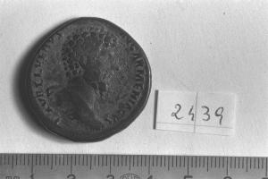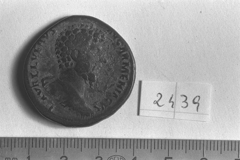 Recto: Busto laureato e corazzato di L. Vero, a destra . Contorno di perline.\nVerso: Victoria, alata, drappeggiata, stante, di fronte, rivolta a destra , con trofeo, puntato in alto, nelle mani; davanti, prigioniero,, con indosso tiara e brache, seduto, a destra , a terra, con la testa posata sulla sinistra in gesto di sconforto, la destra a terra; a terra scudo rotondo. Contorno di perline.