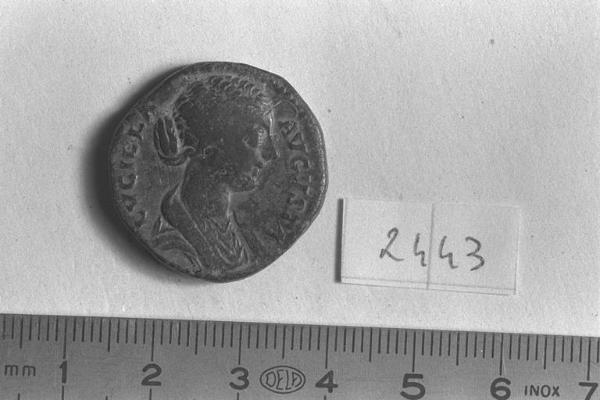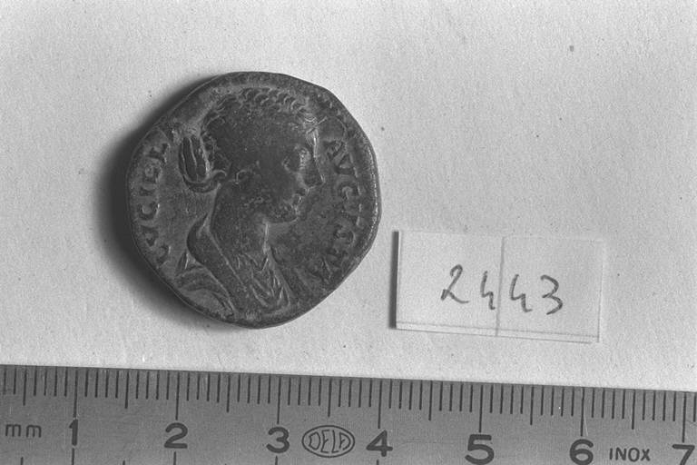 Recto: Busto drappeggiato di Lucilla, a destra , con capelli ondulati raccolti in uno chignon basso sulla nuca. Contorno di perline.\nVerso: Venere, drappeggiata, stante, di fronte, rivolta a sinistra, con mela nella destra protesa, scosta la veste dal collo con la sinistra. Contorno di perline.
