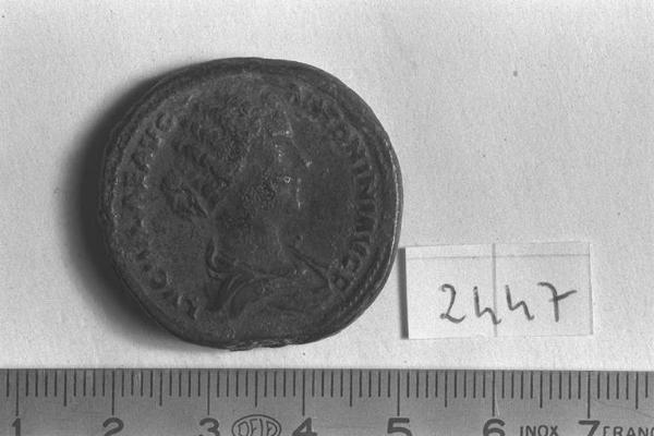 Recto: Busto drappeggiato di Lucilla, a destra , con capelli ondulati raccolti in uno chignon basso sulla nuca. Contorno di perline.\nVerso: Giunone Lucina, drappeggiata, seduta, a sinistra, in trono, con fiore nella destra protesa e bambino in fasce nella sinistra. Contorno di perline.