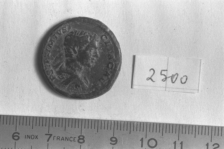 Recto: Busto drappeggiato e corazzato di Geta, a destra , a testa nuda. Contorno di perline.\nVerso: Concordia, drappeggiata, stante, di fronte, rivolta a sinistra, tende la destra per toccare uno stendardo e tiene lo scettro trasversale nella sinistra; a sinistra e a destra , tre stendardi. Contorno di perline.