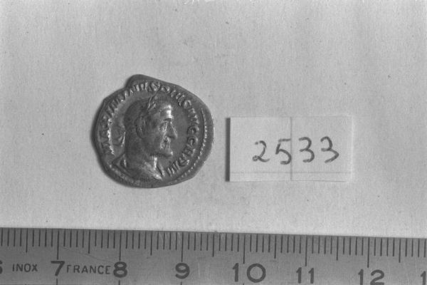 Recto: Busto laureato, barbato, drappeggiato e corazzato di Massimino il Trace, a destra . Contorno di perline.\nVerso: Victoria, drappeggiata, stante, di fronte, rivolta a sinistra, con corona nella destra e ramo di palma nella sinistra; a sinistra, ai suoi piedi, un prigioniero seduto, a sinistra, retrospiciente. Contorno di perline.