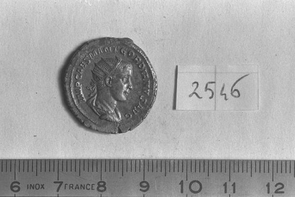 Recto: Busto radiato, drappeggiato e corazzato di Gordiano III, a destra . Contorno di perline.\nVerso: Virtus, con elmo crestato e vesti militari, stante, di fronte, rivolta a sinistra, posa la destra su scudo ovale, a sinistra, e impugna la lancia verticale con la sinistra. Contorno di perline.