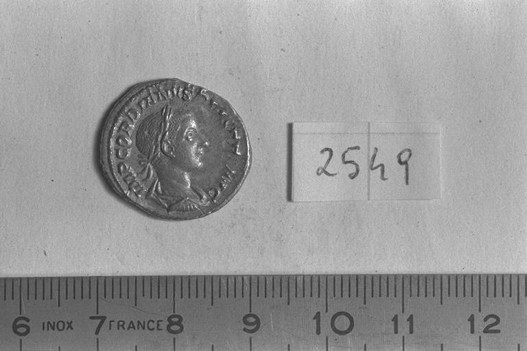 Recto: Busto laureato, drappeggiato e corazzato di Gordiano III, a destra . Contorno di perline.\nVerso: Pietas, velata, drappeggiata, stante, di fronte, rivolta a sinistra, con entrambe le braccia levate in gesto di preghiera. Contorno di perline.