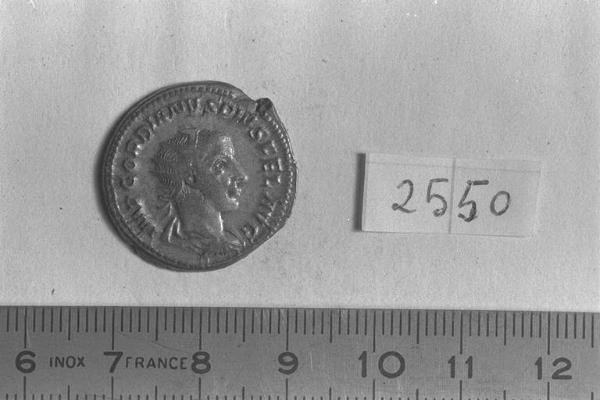 Recto: Busto radiato, drappeggiato e corazzato di Gordiano III, a destra . Contorno di perline.\nVerso: Felicitas, diademata, drappeggiata, stante, di fronte, rivolta a sinistra, con caduceo lungo nella destra e cornucopia nella sinistra. Contorno di perline.