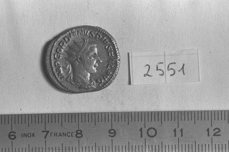 Recto: Busto radiato, drappeggiato e corazzato di Gordiano III, a destra . Contorno di perline.\nVerso: Sol, radiato, con mantello dietro le spalle sul corpo nudo, stante, di fronte, rivolto a sinistra, leva la destra, reggendo il globo nella sinistra. Contorno di perline.