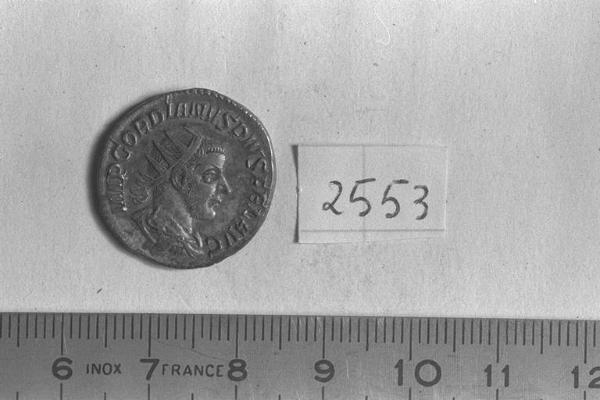 Recto: Busto radiato, drappeggiato e corazzato di Gordiano III, a destra . Contorno di perline.\nVerso: Victoria, alata, drappeggiata, stante, a sinistra, appoggia la destra allo scudo, a terra, e tiene nella sinistra il ramo di palma; sotto lo scudo, un prigioniero. Contorno di perline.
