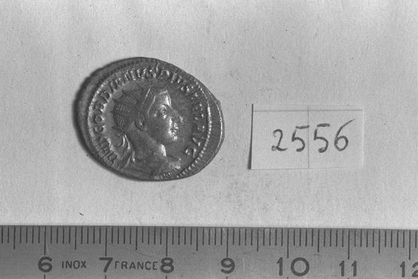 Recto: Busto radiato, drappeggiato e corazzato di Gordiano III, a destra . Contorno di perline.\nVerso: Ercole, nudo, stante, a destra , appoggia la destra al fianco e la sinistra sulla clava collocata su roccia; accanto alla clava, leontea. Contorno di perline.