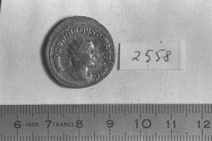 Recto: Busto radiato, drappeggiato e corazzato di Gordiano III, a destra . Contorno di perline.\nVerso: Securitas, drappeggiata, stante, di fronte, rivolta a sinistra, con la gamba sinistra sovrapposta alla destra, impugna lo scettro con la destra e si appoggia con la sinistra alla colonna. Contorno di perline.