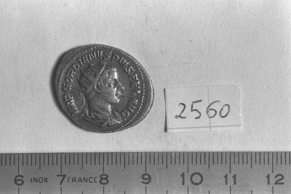 Recto: Busto radiato, drappeggiato e corazzato di Gordiano III, a destra . Contorno di perline.\nVerso: Sol, radiato, con mantello dietro le spalle sul corpo nudo, stante, di fronte, rivolto a sinistra, leva la destra, reggendo il globo nella sinistra. Contorno di perline.