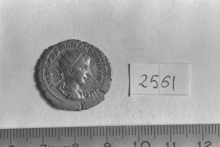 Recto: Busto radiato, drappeggiato e corazzato di Gordiano III, a destra . Contorno di perline.\nVerso: Gordiano, velato, togato, stante, di fronte, rivolto a sinistra, in atto di sacrificare davanti all'altare, a sinistra, con la patera nella destra e la bacchetta nella sinistra. Contorno di perline.