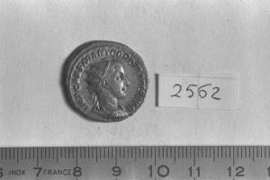 Recto: Busto radiato, drappeggiato e corazzato di Gordiano III, a destra . Contorno di perline.\nVerso: Fides, drappeggiata, stante, di fronte, rivolta a sinistra, con stendardo verticale nella destra e scettro trasversale nella sinistra. Contorno di perline.