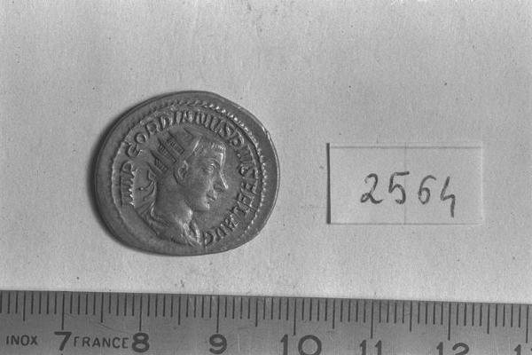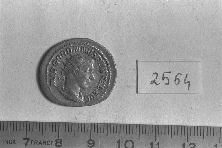Recto: Busto radiato, drappeggiato e corazzato di Gordiano III, a destra . Contorno di perline.\nVerso: Victoria, alata, drappeggiata, stante, a sinistra, appoggia la destra allo scudo, a terra, e tiene nella sinistra il ramo di palma; sotto lo scudo, un prigioniero. Contorno di perline.