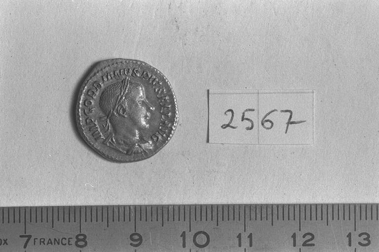 Recto: Busto laureato, drappeggiato e corazzato di Gordiano III, a destra . Contorno di perline.\nVerso: Venere, drappeggiata, stante, a sinistra, con elmo nella destra protesa e scettro nella sinistra in atto di appoggiarsi allo scudo ovale posato a terra. Contorno di perline.