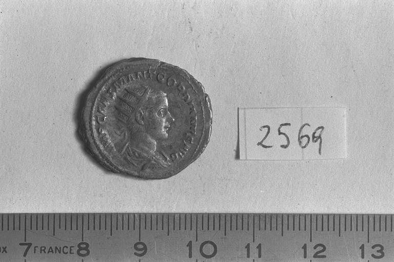 Recto: Busto radiato, drappeggiato e corazzato di Gordiano III, a destra . Contorno di perline.\nVerso: Giove, nudo, stante di fronte, rivolto a sinistra, con fulmine nella destra protesa sulla testa di Gordiano, stante, a sinistra, e scettro verticale nella sinistra. Contorno di perline.