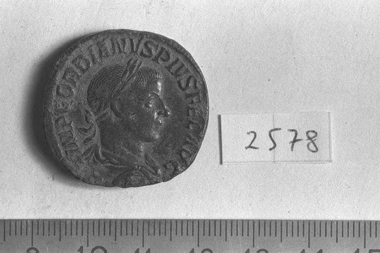 Recto: Busto laureato, drappeggiato e corazzato di Gordiano III, a destra . Contorno di perline.\nVerso: Giove, nudo, stante, di fronte, rivolto a destra , con lungo scettro nella destra e fulmine nella sinistra. Contorno di perline.