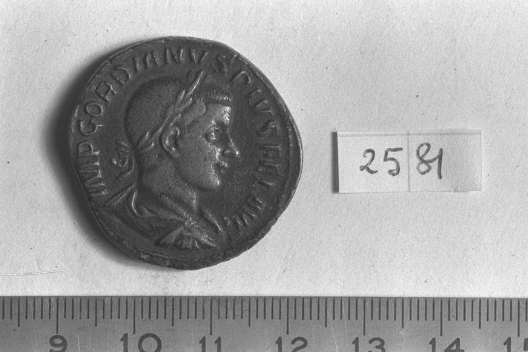 Recto: Busto laureato, drappeggiato e corazzato di Gordiano III, a destra . Contorno di perline.\nVerso: Laetitia, drappeggiata, stante, a sinistra, con corona nella destra e ancora nella sinistra. Contorno di perline.